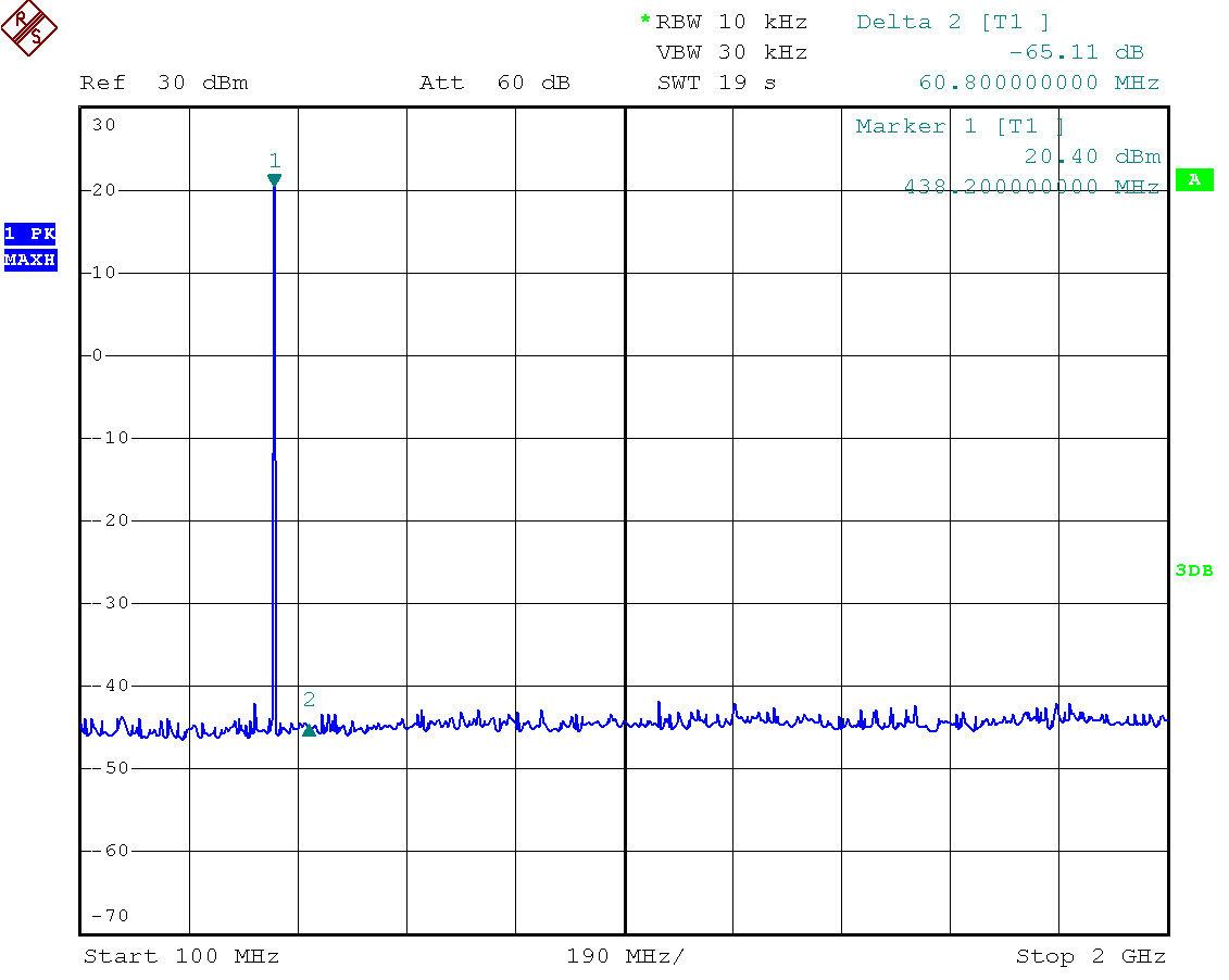 Ausgangsspektrum GM1200 Wie man erkennen kann, sind unerwünschte Nebenaussendungen mit mindestens 65 dBc unterdrückt.