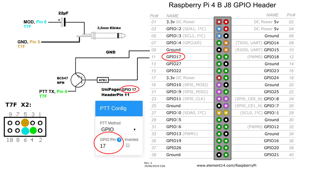 Das Funkgerät wird einfach mit einem 22 µF Kondensator in der Signalleitung an die auf dem Raspberry Pi vorhandene Soundkarte angeschlossen. Die PTT Leitung des Funkgerätes erwartet einen Kurzschluss nach Masse, um auf Sendung zu gehen. Diese Signal von von den Raspberry Pi GPIO-Anschlüssen abgegriffen werden. Da der Raspberry Pi aber nur maximal 3,3 V an seinen GPIOs verträgt, muss ein NPN Transistor (z.B. BC547) als Open-Collector vorgeschaltet werden. Also GPIO → 470 Ohm Widerstand → Basis. Emitter kommt an Masse (kann direkt auf der GPIO-Leiste abgeriffen werden) und der Kolletor kommt an den PTT-Pin vom Funkgerät. Wichtig ist hier die GPIO Bezeichnung. Die entspricht der fett gedruckten Nummer, siehe auch unter GPIO Pinout Quelle: http://pi4j.com/images/j8header-2b-large.png