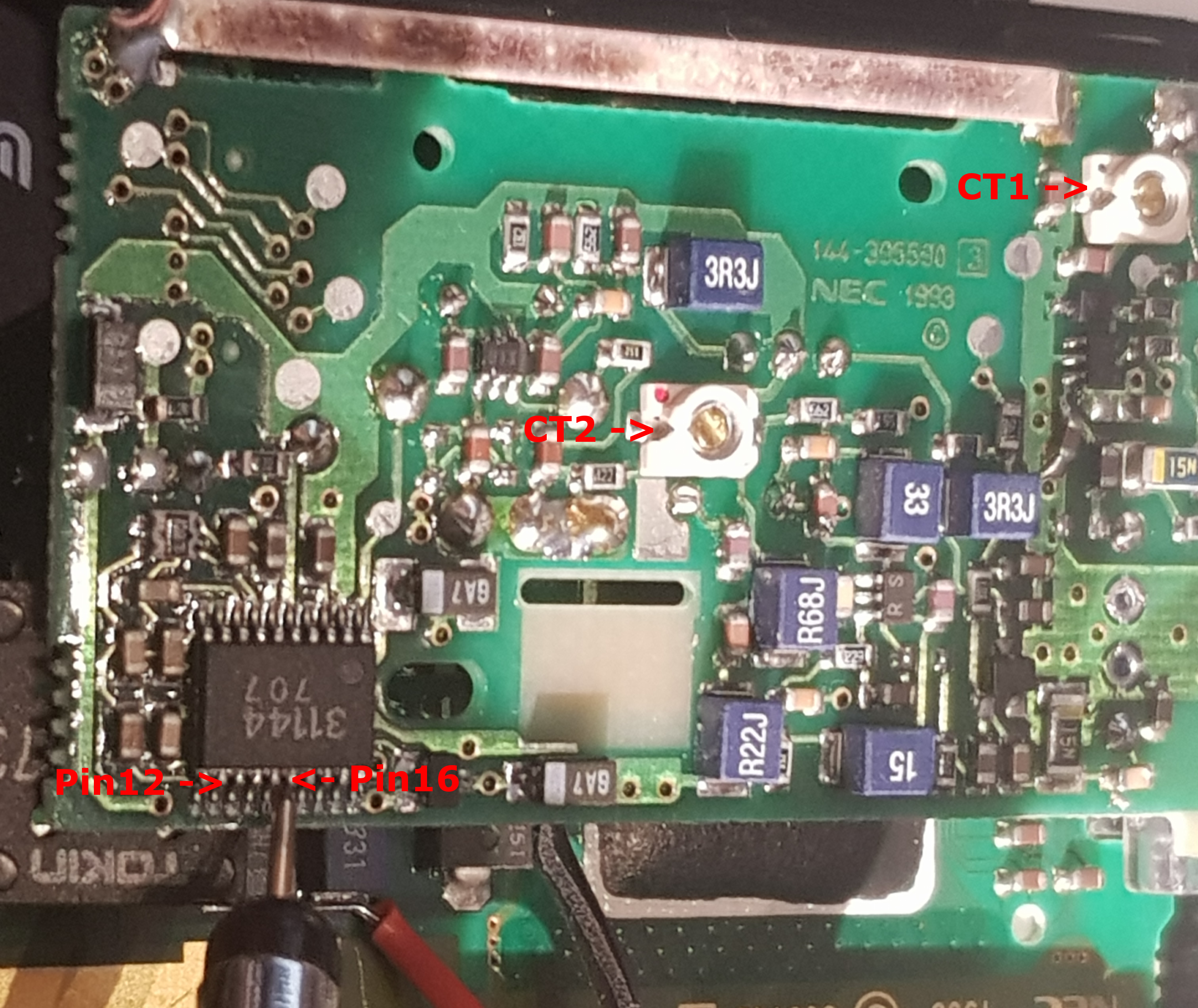 When this is finished you can improve reception by tuning the antenna circuit to maximum signal strength. Therefore conncect your scope to pin 12 and tune to maximum signal by turning trimmer CT1 carefully.