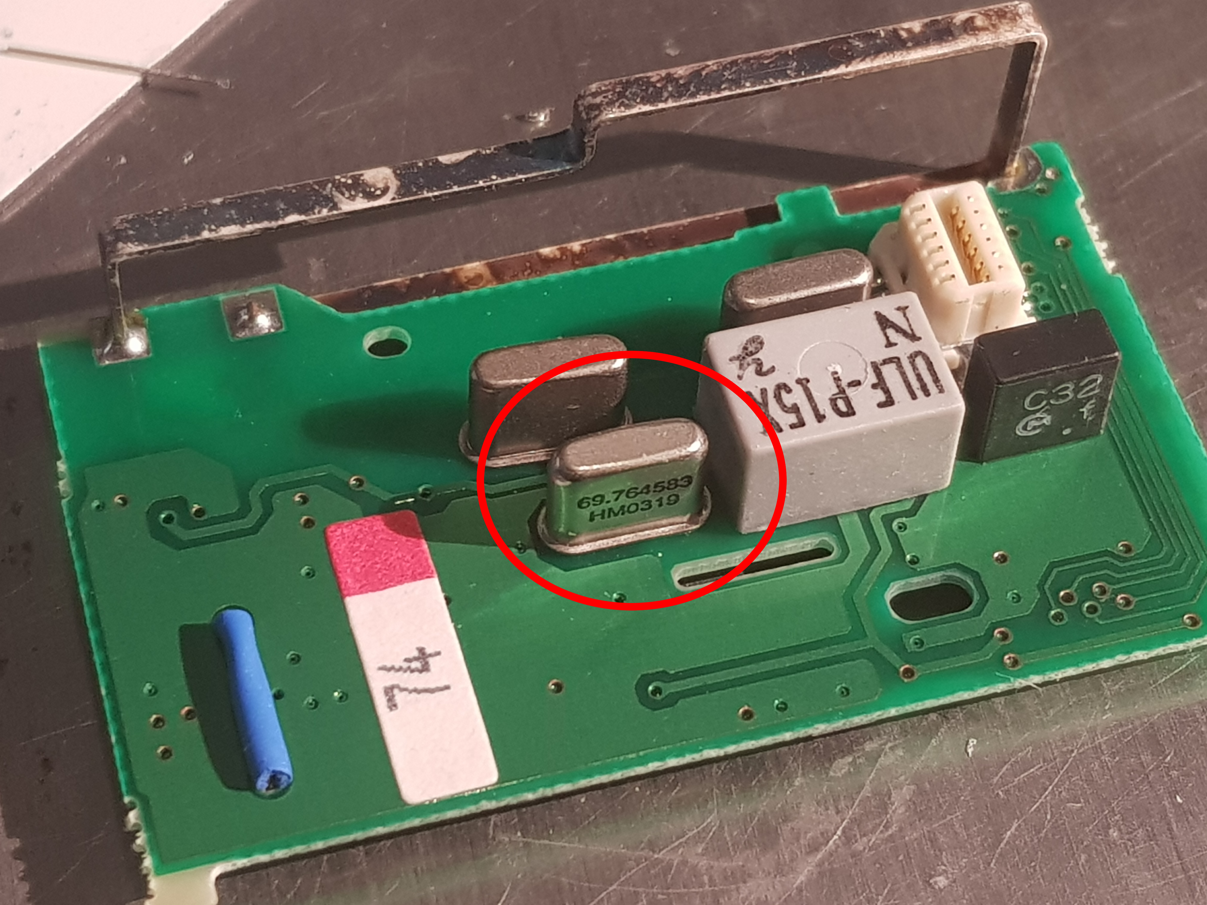 Next is to exchange the crystal to get the LO to the correct frequency. You will need a crystal with 69.764583MHz to get the Primo working on the (German) centralized DAPNET frequency of 439.9875 MHz. To remove the old crystal you can remove solder with a desoldering pump.