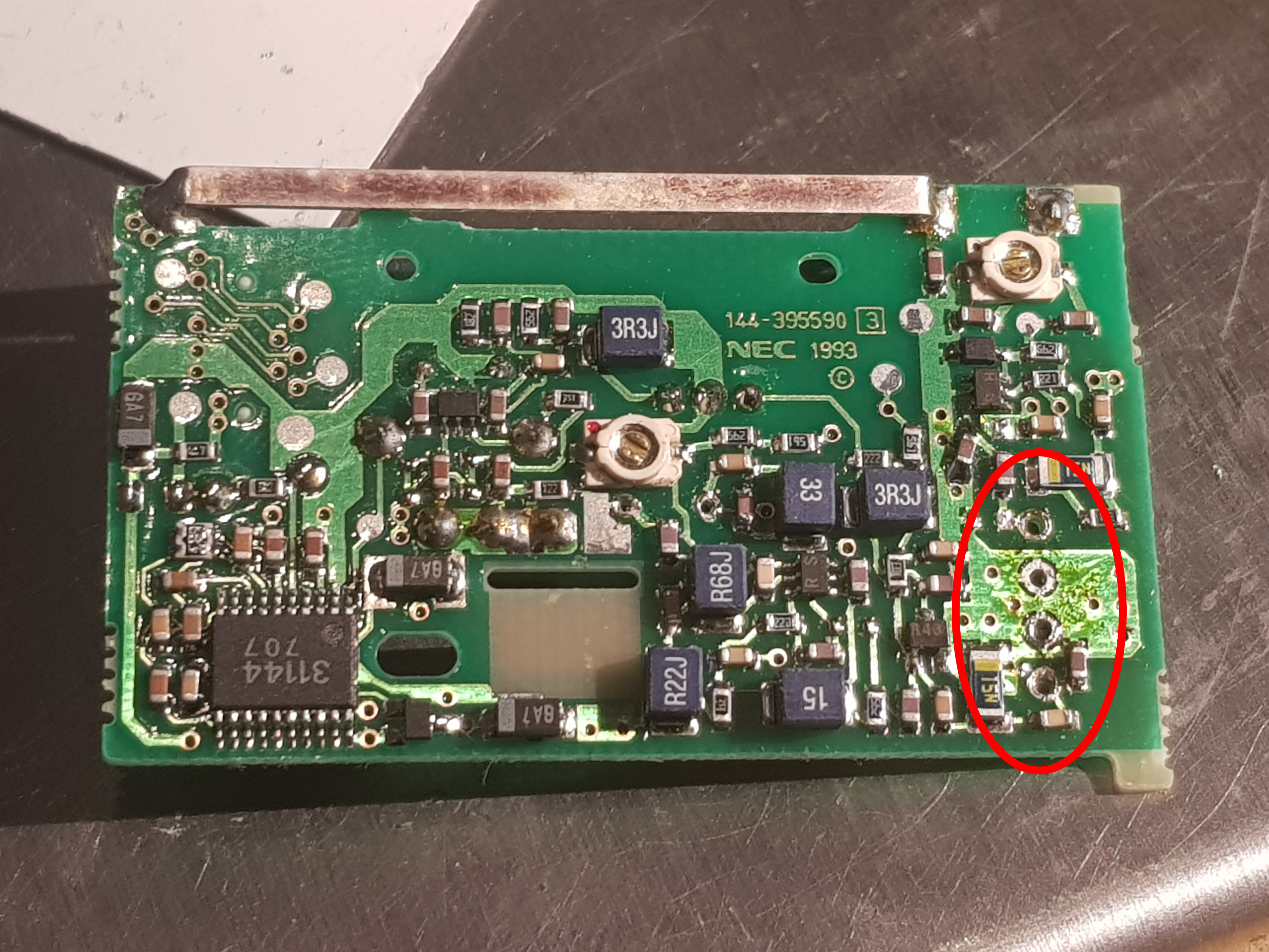 Like the modification for the Skyper pagers it is necessary to remove the SAW filter which is desgined for 460MHz range. On this PCB you have to take care about the adjacent SMD parts at the outer pins of the SAW. Remove solder with a pump or solder wick on the in- and output. The middle two pins are GND and should be heatede at once to remove the filter afterwards.