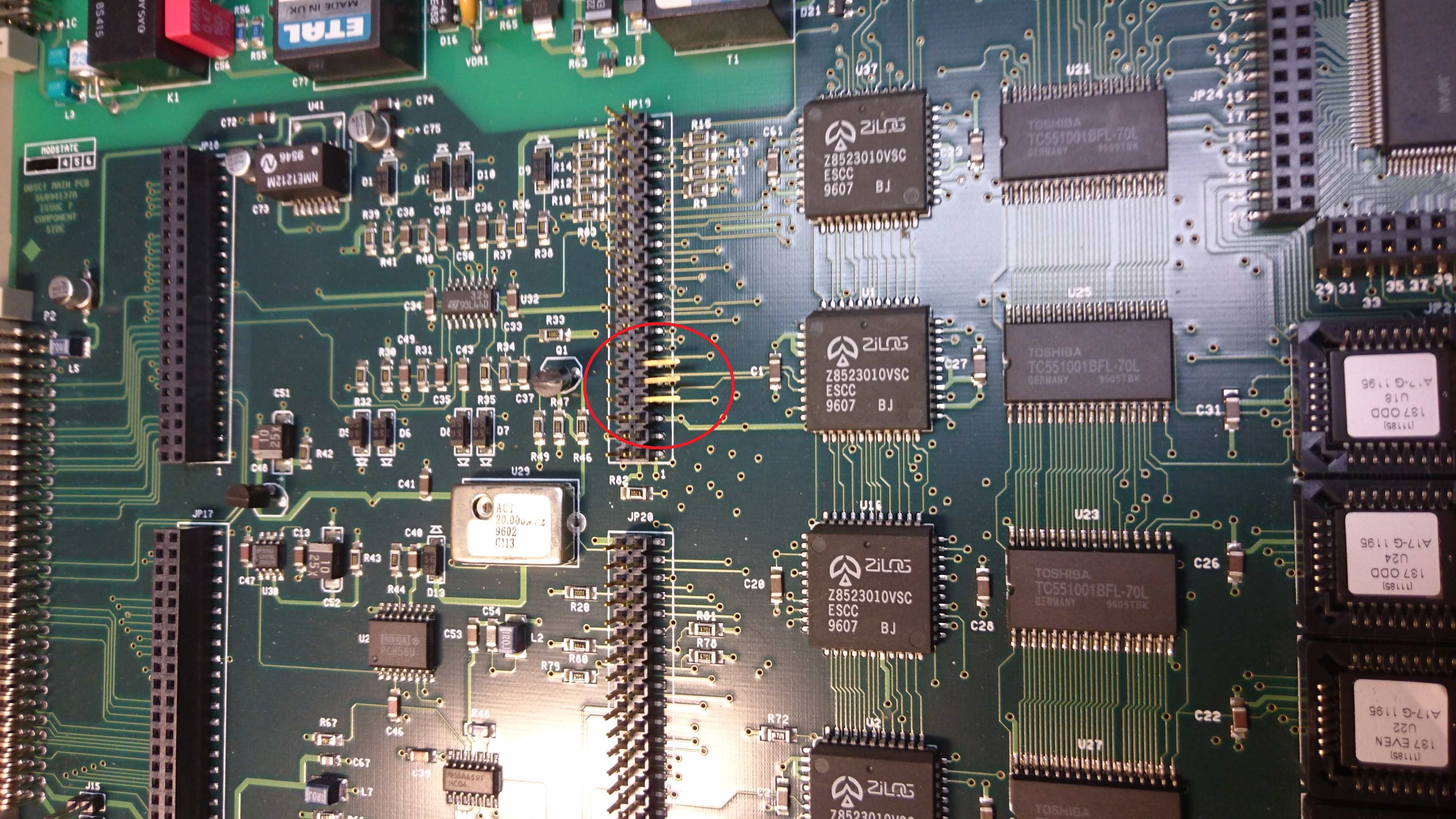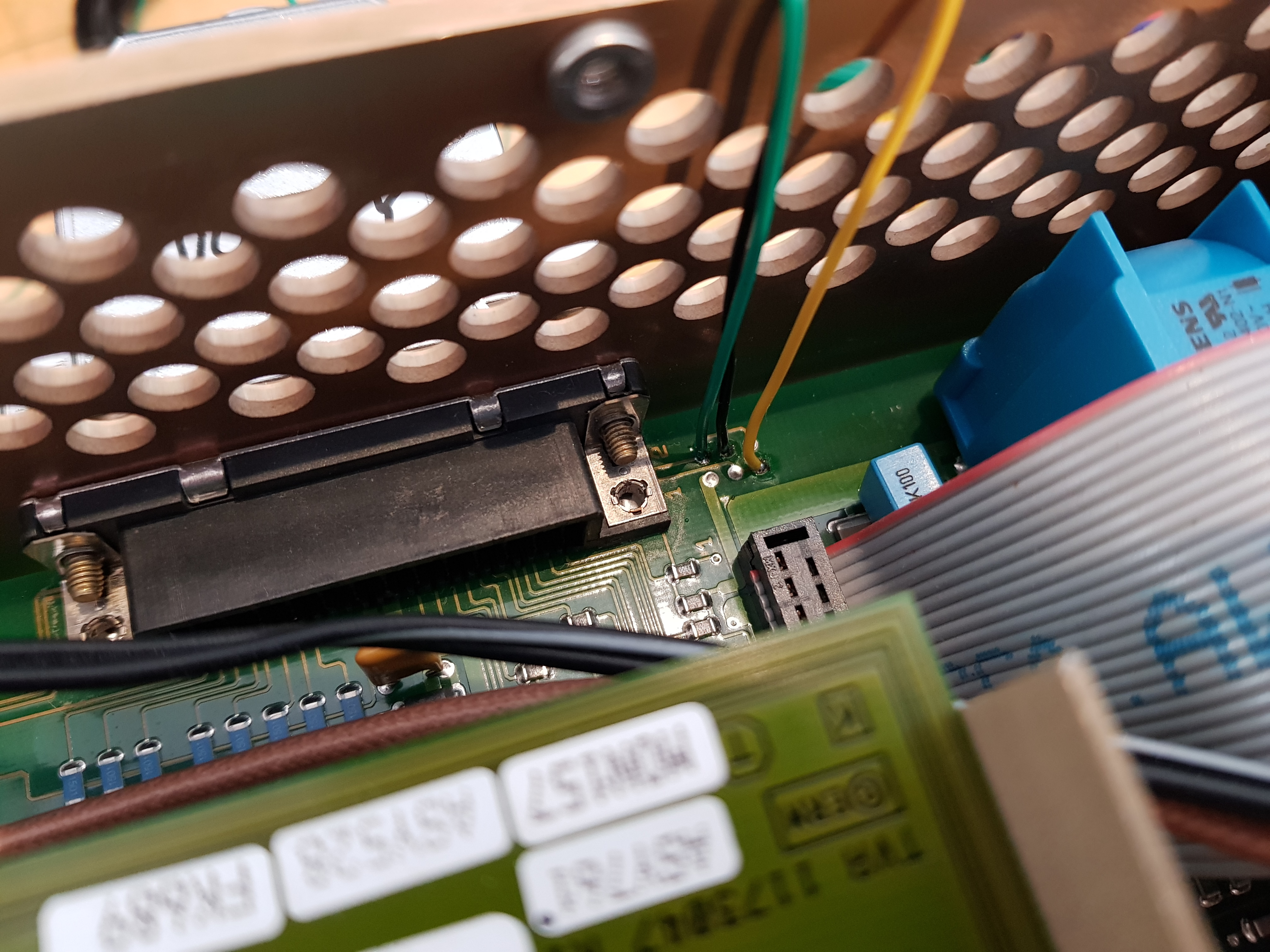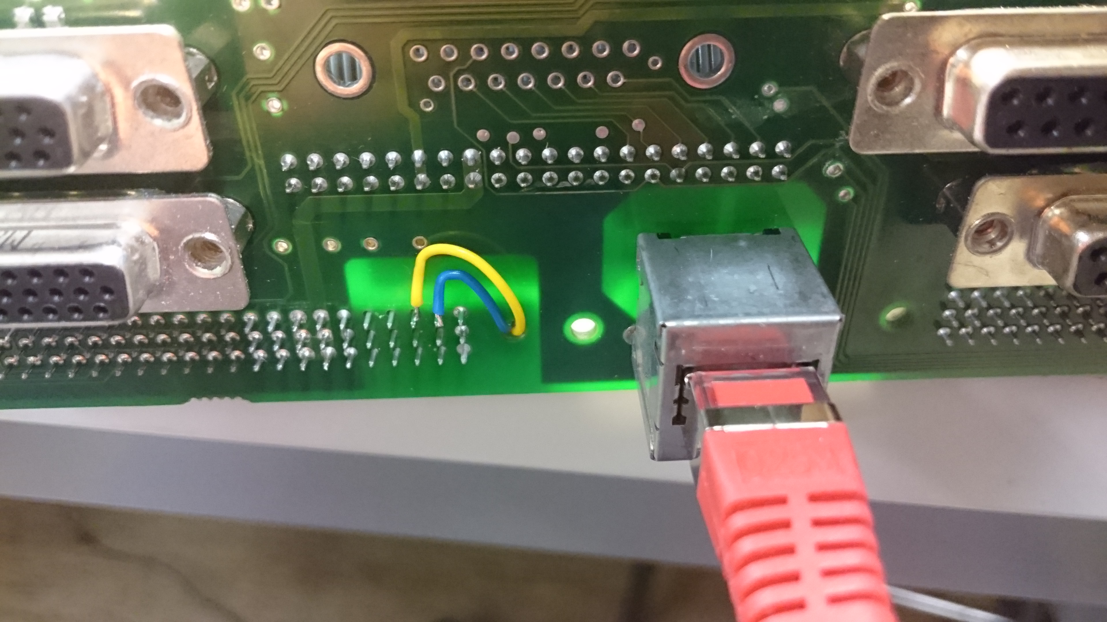 As there are only pins 3 and 6 of the RJ45 jack routed on the backplane PCB (remember: former use was landline telephone), you have to connect the pins 1 and 2 by yourselves to the backplace-to-plugin-board connector. Unfortunately, you have to remove and disassemble the backplane completly in order to do so. So take a deep breath and remove all the SUB-D connector threaded sleeves on the backplane. Also remove the four screws holding the backplane and unplug the ribbon cable. Then remove the back plane shield from the backplane PCB.