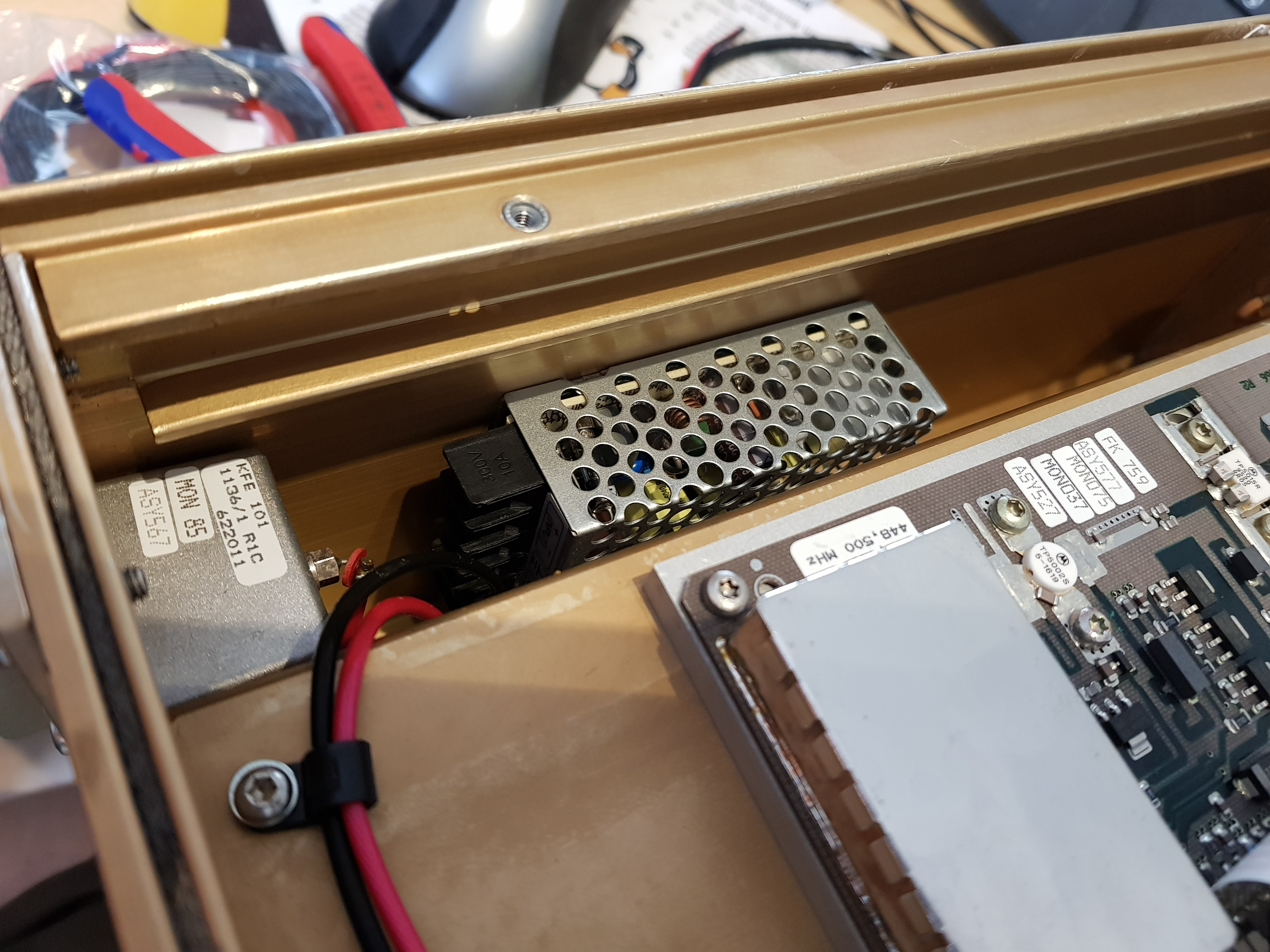There is an internal 5v0 rail but it is unsure if that can supply continous current for running the Raspberry Pi. One solution is to use a DC/DC converter powered by the 24V input. A Mean Well SD-15B-05 is a good choice. The case fits exactly into the small slot aside from the exciter unit. You just have arrange some wires to the backplane of the Base Station Controller board. There are some free pins that can also be used for the ethernet connection of the Raspberry Pi. It can be mounted with two 3mm screws to the side of the case. That should also allow for some heat dissipation.