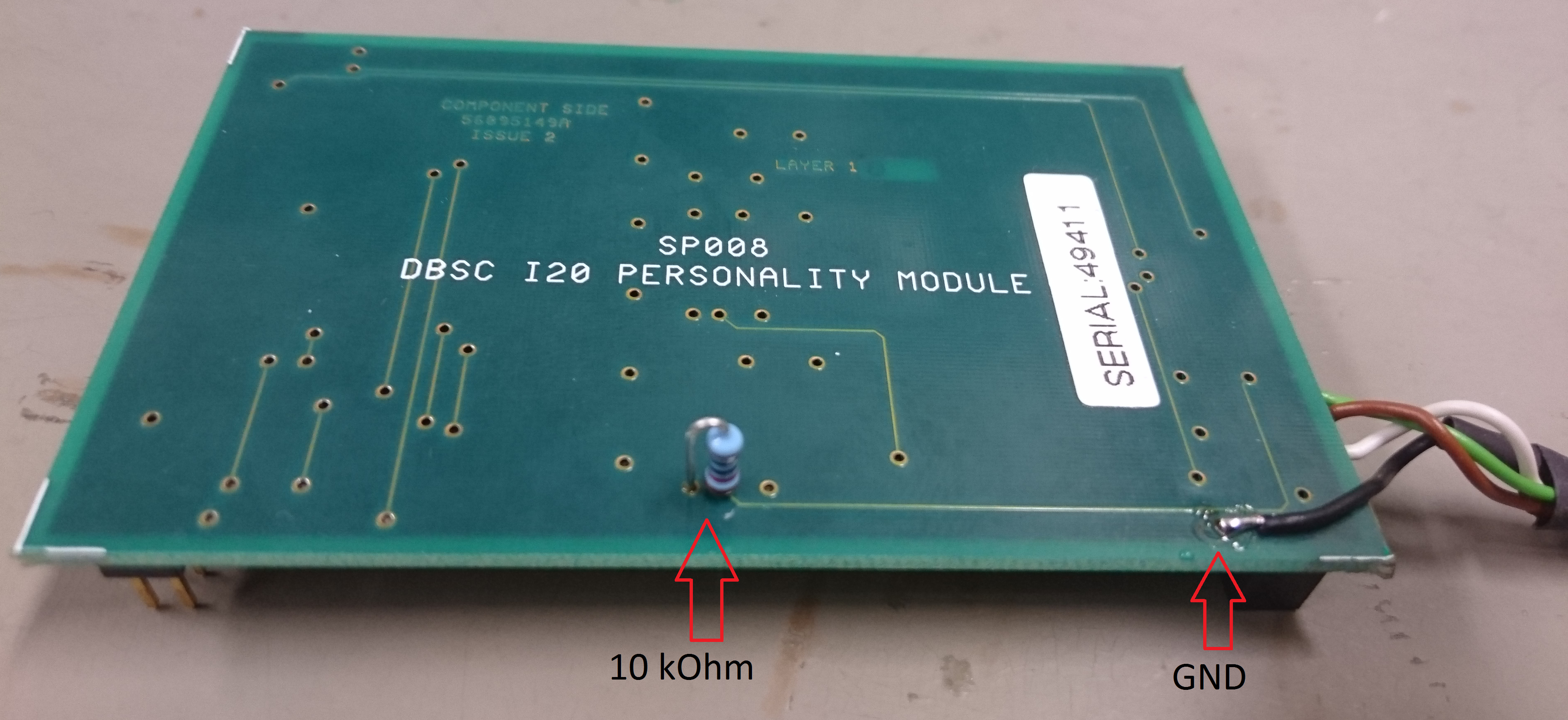 If you have an already modified C9000 with the RCP card formerly used, the 10 kOhm resistor will be already in place. Just add cables from the RasPagerC9000 PCB to the PCB of the personality module and fit it again. Be aware, that not all vias on the personality module are GND, although it might look like this.