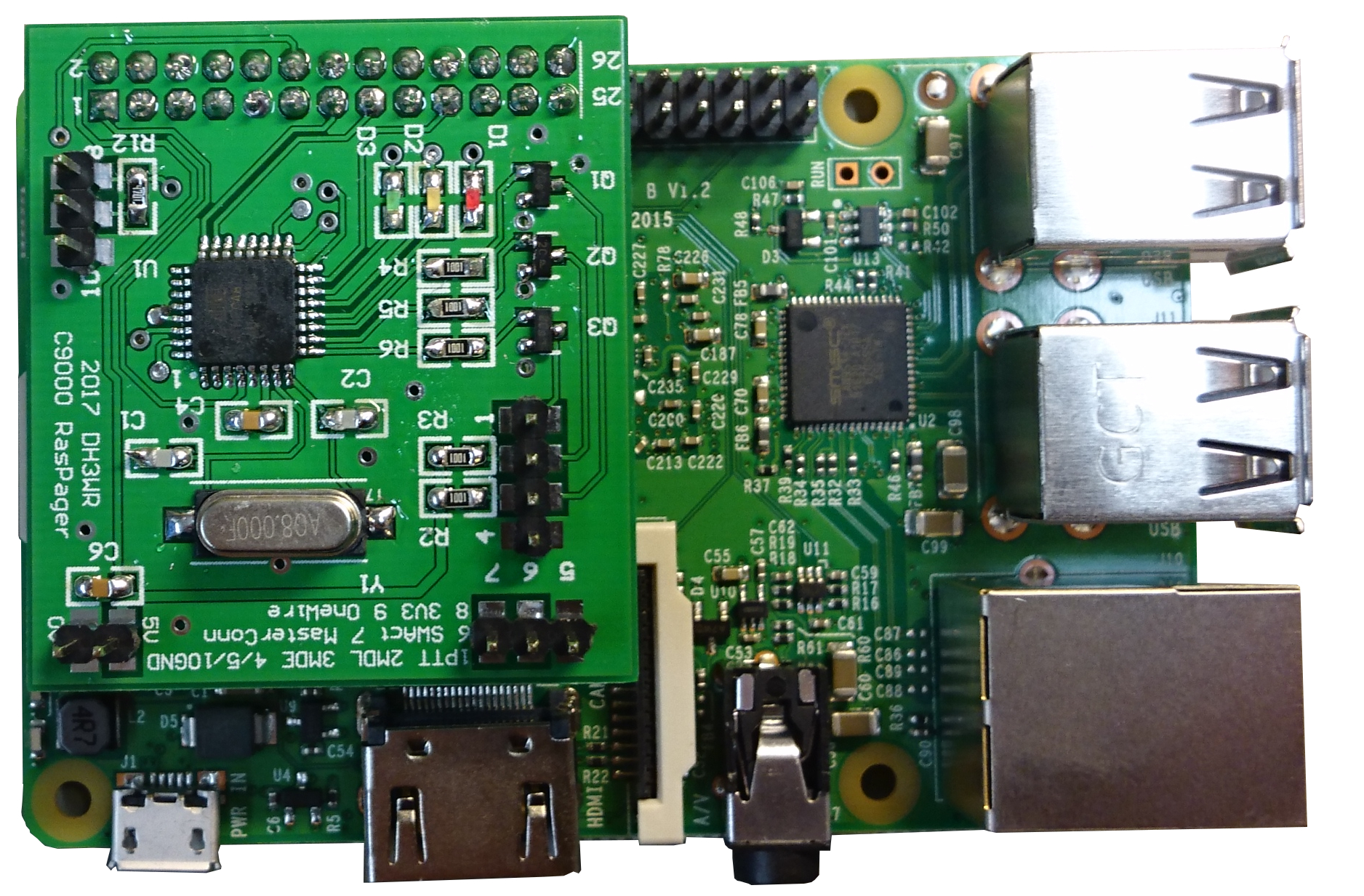 There are three LEDs on the RasPagerC9000. Their meaning is: