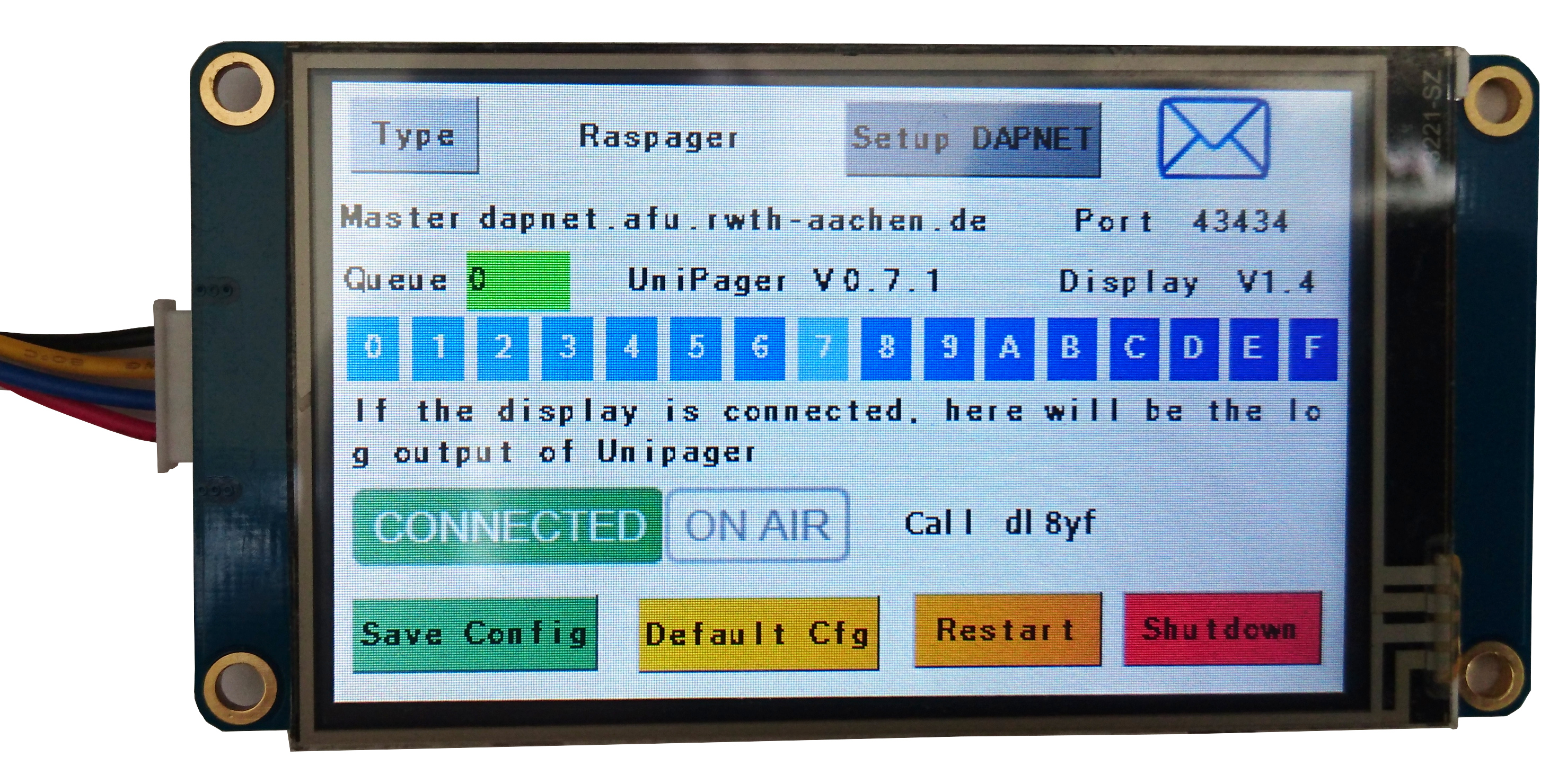 Every project nowadays reaches for nice user interface. The display models from the company Nextion are quite famous due to their price and capabilities. The connection is made by a 3.3 V UART interface, either by a USB-TTL 3.3 V adapter or via the RasPi's onboard UART, if not already used. The software is written in Python can can be found here. https://github.com/rwth-afu/UniPagerNextion